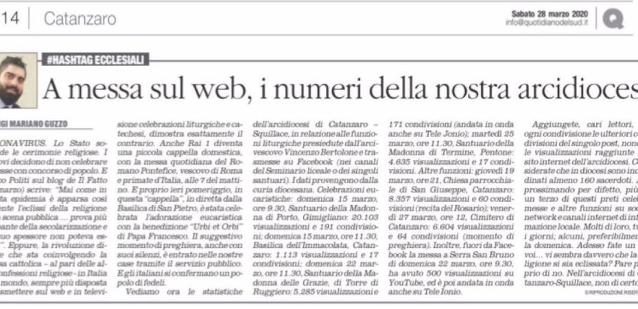 Aggiungete, cari lettori, ad ogni condivisione le ulteriori condivisioni del singolo post, nonché le visualizzazioni raggiunte sul sito internet dell’arcidiocesi. Considerate che in diocesi sono incardinati almeno 160 sacerdoti. Approssimando per difetto, più di un terzo di questi preti celebra messe e altre funzioni su social network e canali internet di informazione locale. Molti di loro, tutti i giorni; alcuni, preferibilmente, la domenica. Adesso fate un po’ voi… vi sembra davvero che la religione si sia eclissata? Pare proprio di no. Nell’arcidiocesi di Catanzaro-Squillace, non di certo.