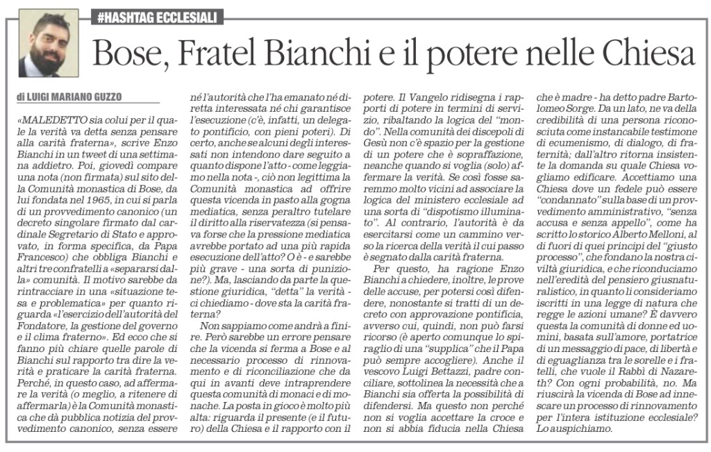 Non sappiamo come andrà a finire. Però sarebbe un errore pensare che la vicenda si ferma a Bose e al necessario processo di rinnovamento e di riconciliazione che da qui in avanti deve intraprendere questa comunità di monaci e di monache. La posta in gioco è molto più alta: riguarda il presente (e il futuro) della Chiesa e il rapporto con il potere. Il Vangelo ridisegna i rapporti di potere in termini di servizio, ribaltando la logica del “mondo”. Nella comunità dei discepoli di Gesù non c’è spazio per la gestione di un potere che è sopraffazione, neanche quando si voglia (solo) affermare la verità. Se così fosse saremmo molto vicini ad associare la logica del ministero ecclesiale ad una sorta di “dispotismo illuminato”. Al contrario, l’autorità è da esercitarsi come un cammino verso la ricerca della verità il cui passo è segnato dalla carità fraterna. Per questo, ha ragione Enzo Bianchi a chiedere, inoltre, le prove delle accuse, per potersi così difendere, nonostante si tratti di un decreto con approvazione pontificia, avverso cui, quindi, non può farsi ricorso (è aperto comunque lo spiraglio di una “supplica” che il Papa può sempre accogliere). Anche il vescovo Luigi Bettazzi, padre conciliare, sottolinea la necessità che a Bianchi sia offerta la possibilità di difendersi. Ma questo non perché non si voglia accettare la croce e non sia abbia fiducia nella Chiesa che è madre – ha detto padre Bartolomeo Sorge. Da un lato, ne va della credibilità di una persona riconosciuta come instancabile testimone di ecumenismo, di dialogo, di fraternità; dall’altro ritorna insistente la domanda su quale Chiesa vogliamo edificare. Accettiamo una Chiesa dove un fedele può essere “condannato” sulla base di un provvedimento amministrativo, “senza accusa e senza appello”, come ha scritto lo storico Alberto Melloni, al di fuori di quei principi del “giusto processo”, che fondano la nostra civiltà giuridica, e che riconduciamo nell’eredità del pensiero giusnaturalistico, in quanto li consideriamo iscritti in una legge di natura che regge le azioni umane? E’ davvero questa la comunità di donne ed uomini, basata sull’amore, portatrice di un messaggio di pace, di libertà e di eguaglianza tra le sorelle e i fratelli, che vuole il Rabbì di Nazareth? Con ogni probabilità, no. Ma riuscirà la vicenda di Bose ad innescare un processo di rinnovamento per l’intera istituzione ecclesiale? Lo auspichiamo.