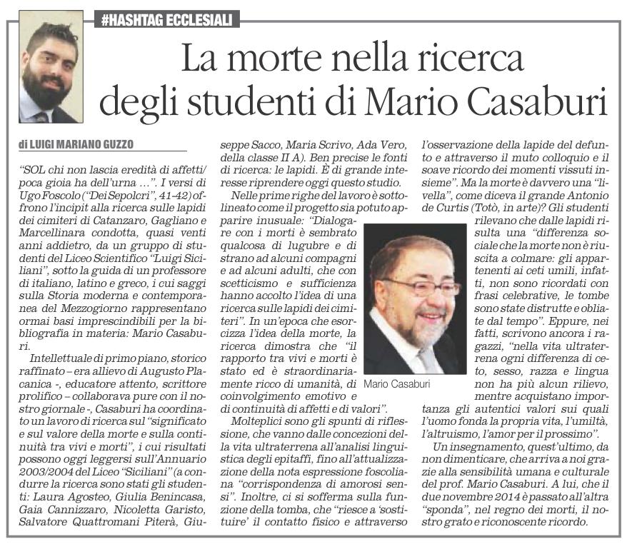 In occasione del 2 novembre, commemorazione dei fedeli defunti, pubblico qui un mio articolo comparso su “Il Quotidiano del Sud” il 31 ottobre 2020. L’invito è di riprendere in mano una ricerca condotta, quasi vent’anni addietro, dagli studenti del Liceo Scientifico “Siciliani” di Catanzaro, e coordinata dal Prof. Mario Casaburi, sulle lapidi dei cimiteri di Catanzaro, Gagliano e Marcellinara. In quegli anni ero anch’io suo studente (nella sezione “C”, non coinvolta in questa specifica attività), e ricordo bene quanto a molti potesse apparire inusuale la proposta di ricerca del “mio” Prof. Casaburi. Eppure, l’alto valore formativo è ancora oggi testimoniato dalle pagine pubblicate sull’Annuario del Liceo “Siciliani”, che inserisco in allegato alla fine dell’articolo. Un’ultima nota: sono stato vicino al Prof. Casaburi negli ultimi anni della grave malattia che l’ha colpito. Verrà poi a mancare il 2 novembre 2014 (già, proprio oggi ne ricorre l’anniversario!). Credo che di lui davvero si possa dire che è morto per come ha vissuto, accettando con sapienza – quella che viene dallo studio dei testi della letteratura greca, latina e del pensiero cristiano – e con fede – quella che matura liberamente dal cuore – la sofferenza, il dolore, il distacco e la finitudine di una condizione umana, che aspira alla luce dell’Eterna vita.