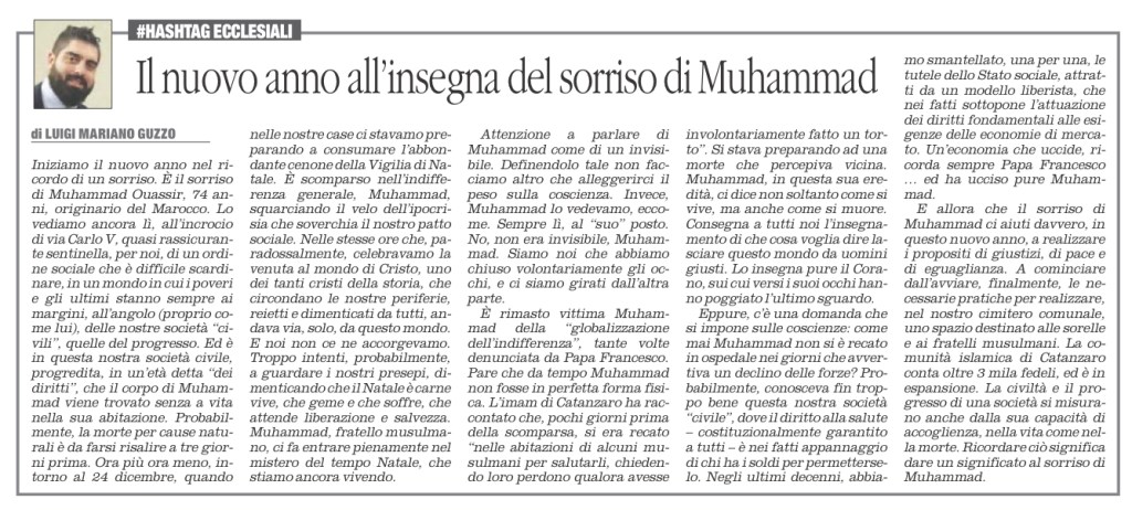 Iniziamo il nuovo anno nel ricordo di un sorriso. È il sorriso di Muhammad Ouassir, 74 anni, originario del Marocco. Lo vediamo ancora lì, all’incrocio di via Carlo V, quasi rassicurante sentinella, per noi, di un ordine sociale che è difficile scardinare, in un mondo in cui i poveri e gli ultimi stanno sempre ai margini, all’angolo (proprio come lui), delle nostre società “civili”, quelle del progresso. Ed è in questa nostra società civile, progredita, in un’età detta “dei diritti”, che il corpo di Muhammad viene trovato senza a vita nella sua abitazione. Probabilmente, la morte per cause naturali è da farsi risalire a tre giorni prima. Ora più ora meno, intorno al 24 dicembre, quando nelle nostre case ci stavamo preparando a consumare l’abbondante cenone della Vigilia di Natale. È scomparso nell’indifferenza generale, Muhammad, squarciando il velo dell’ipocrisia che soverchia il nostro patto sociale. Nelle stesse ore che, paradossalmente, celebravamo la venuta al mondo di Cristo, uno dei tanti cristi della storia, che circondano le nostre periferie, reietti e dimenticati da tutti, andava via, solo, da questo mondo. E noi non ce ne accorgevamo. Troppo intenti, probabilmente, a guardare i nostri presepi, dimenticando che il Natale è carne viva, che geme e che soffre, che attende liberazione e salvezza. Muhammad, fratello musulmano, ci fa entrare pienamente nel mistero del tempo Natale, che stiamo ancora vivendo.